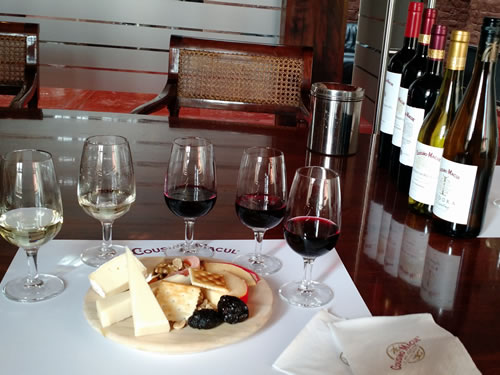 Em seguida fomos separados do grupo e encaminhados a uma sala adjacente ao próprio hall da recepção, destinada à degustação premium. Além de cinco rótulos distintos, à mesa estava uma seção de queijos, pães e frutas secas destinados à harmonização com os vinhos. Muito solícito, nosso guia respondeu a todas as nossas perguntas e inclusive indicou restaurantes e lojas que poderiam ser visitadas mais tarde.