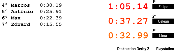 Já na reta final, Felipe conseguiu mais 3 pontos e escapou do último lugar ao se sagrar campeão de Destruction Derby 2. Bem que Ozlean tentou, mas a segunda colocação neste último jogo não foi suficiente para que ele emparelhasse a pontuação com Edward.
