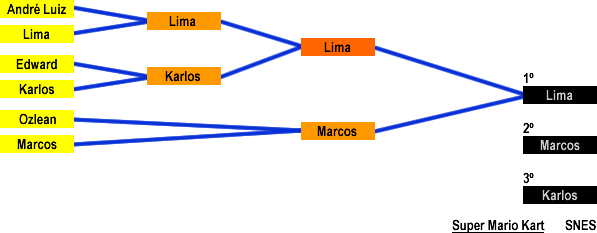 Em Super Mario Kart, as disputas ocorrem no modo MATCH RACE. Como era de se esperar, os mais viciados chegaram à reta final, mas Marcos viu o título ir embora para as mãos do papai Lima, que derrotou seu Yoshi correndo com o malvado Bowser.