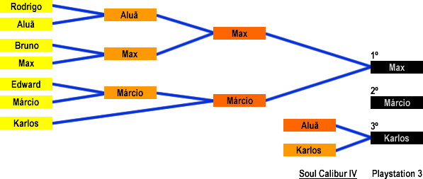 Mudando de console, já que apareceu por aqui uma vez no Xbox 360, Soul Calibur IV foi a garantia de um encerramento em grande estilo. E, em meio ao fim, um herói nasceu: Márcio. Sinceramente, os vizinhos deviam estar achando que a bruxa estava solta dentro do apartamento, tamanha foi a vibração dos presentes quando o rapaz despachou Edward e Karlos em sua campanha rumo à final.