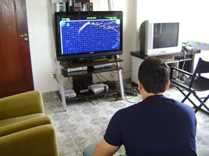 Disposto a garantir logo de cara seus primeiros pontos, Karlos tratou de jogar na roda Geometry Wars, que ele vinha treinando sistematicamente nos últimos dias. Infelizmente, algo saiu muito errado porque o rapaz comeu poeira diante dos colegas, alguns deles jogando pela primeira vez na vida!